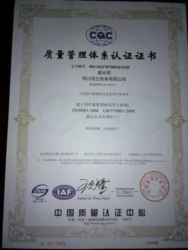 "糖果live平台" 包装质量管理体系认证证书